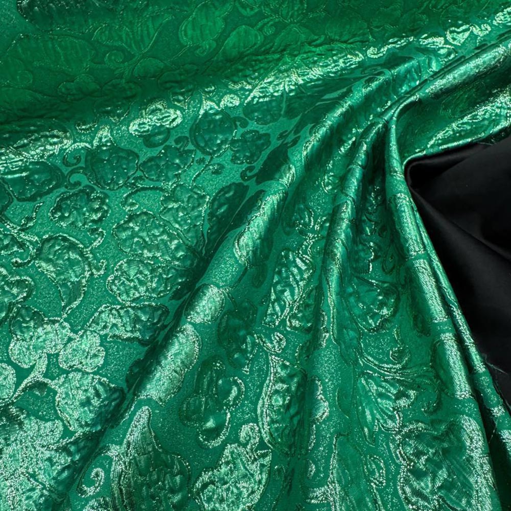 Матлассе с люрексом Guc4i. Яркий насыщенный изумрудный цвет, сверкающий фактурный орнамент. Полотно стабилизированно с изнаночной стороны, за счет чего дополнительно держит форму. Выглядит как богатый вечерний жаккард. Для вечерних образов, для юбок, жакетов, бомберов.