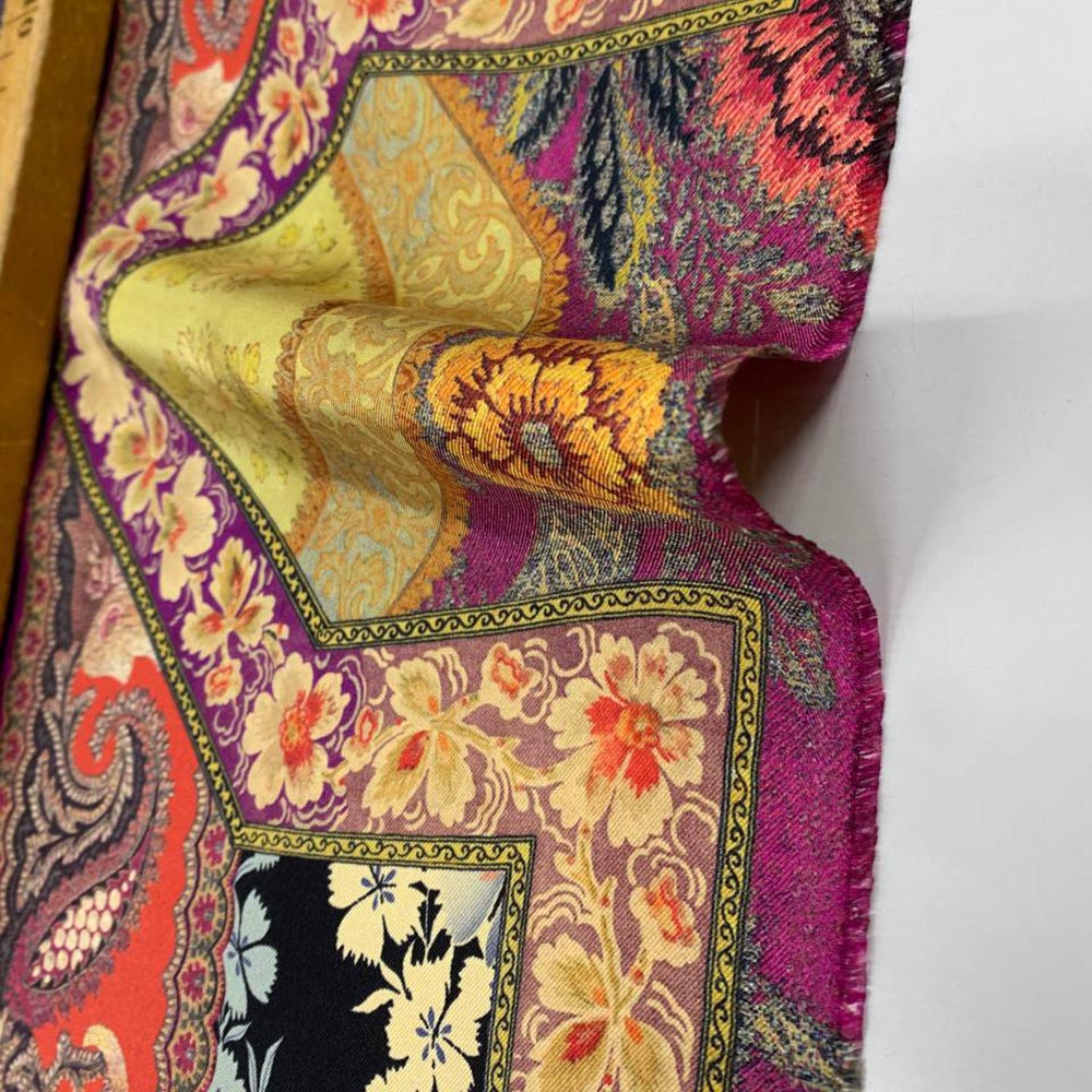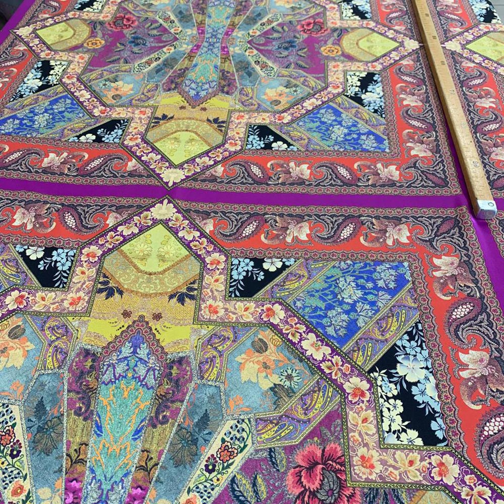 Плательно-блузочный шелк Etr0. Твиловое плетение. Сложный красочный принт в стилистике бренда расположен панелями, ограниченными бордюрами по периметру. Легкий, гладкий шелк для платьев, летящих юбок, блуз. При желание можно изготовить яркий аксессуар.