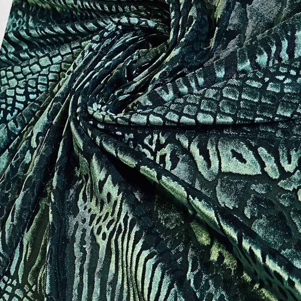 Плательно-блузочный велюр деворе CavaIIi. Королевский изумрудный оттенок. Рисунок представляет собой анималистичный смешанный узор в духе бренда. Красивый эффект перелива. Сам материал легкий, драпирующийся.. Для эффектных блуз, платьев, топов и юбок.