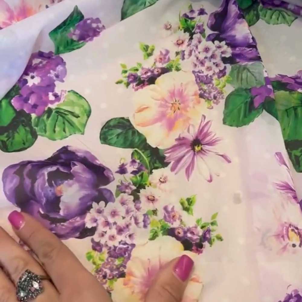 Нежно-розовый фон и живописный романтичный цветочный принт. Невесомый воздушный материал для летящих изделий.