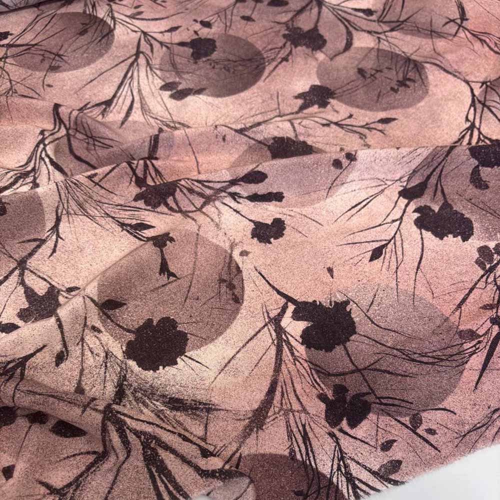 Плательно-блузочный шелковый крепдешин. Ткань с романтичным принтом, похожим на тени растений, на приглушенном розовом фоне. Поверхность абсолютно матовая, с креповой структурой. Мягкий, легкий и пластичный материал для платьев и блуз.