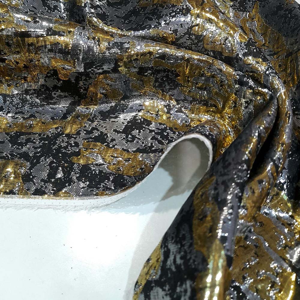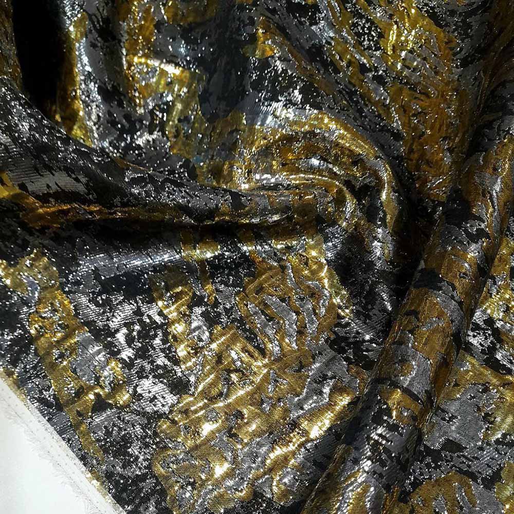 Плательно-костюмный редкий жаккард из шелка с люрексом D0lce Gabbana. Абстрактный орнамент сочетает серебряный, золотой и черные цвета. Двухсторонний материал: вторая сторона более активный вариант в серебряно-золотом варианте. Для вечерних платьев, юбок и костюмов.