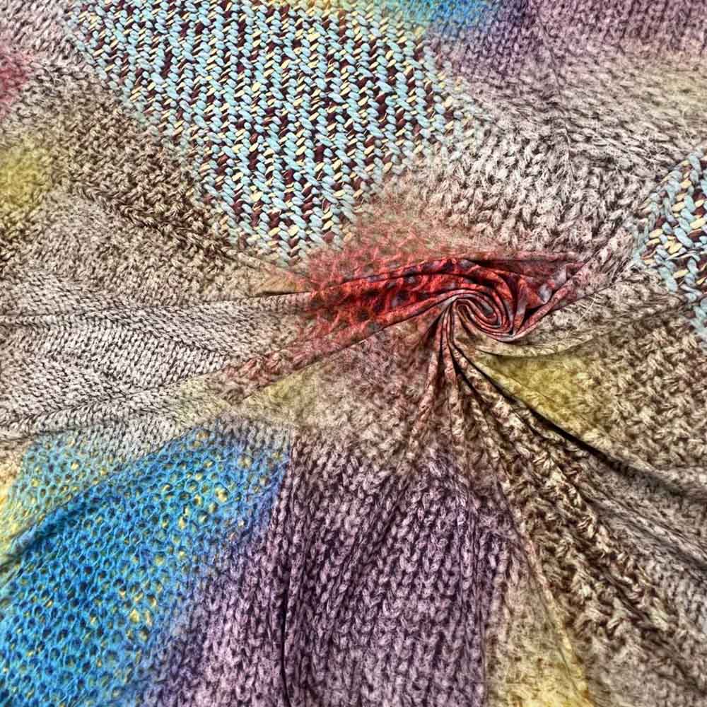 Тонкий вискозный трикотаж с необычным принтом. Изюминка в оригинальном рисунке - своеобразный коллаж из вязаных текстур. Поверхность ткани матовая, тактильно шелковистая. Для уникальных мягких ниспадающих платьев и топов.