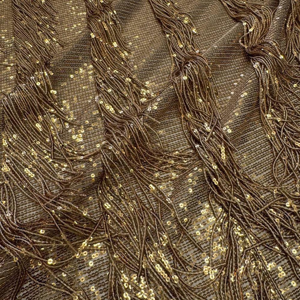Пайетки на сетке с бахромой. Бахрома расположена вертикальными полосками, разделяющими полотно мелких золотистых пайеток. Материал для играющих платьев, юбок.
