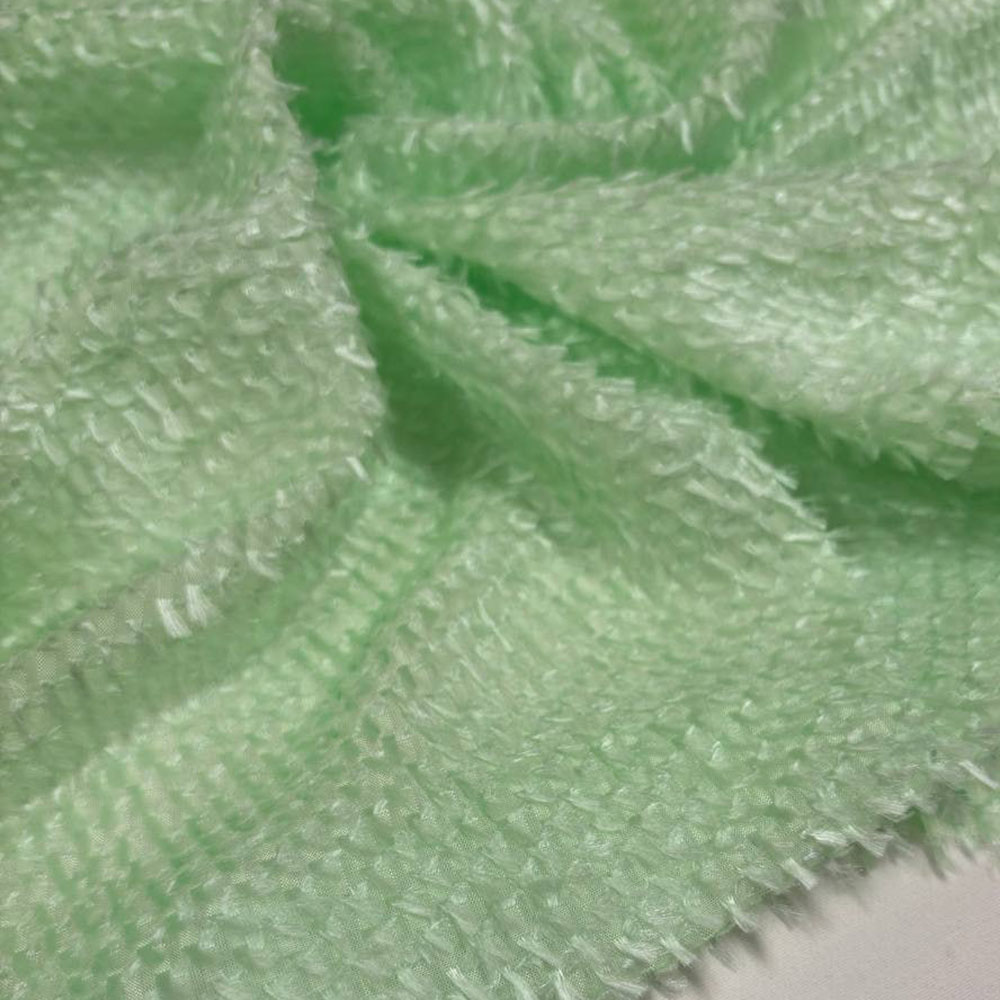 Фактурная плательно-блузочная вискоза. Свежий салатовый оттенок, поверхность украшена ресничками, образующими равномерный фактурный ворс. Красиво переливается на свету. Сама основа мягкая немного просвечивающая. На топы, блузы, платья и отделку.