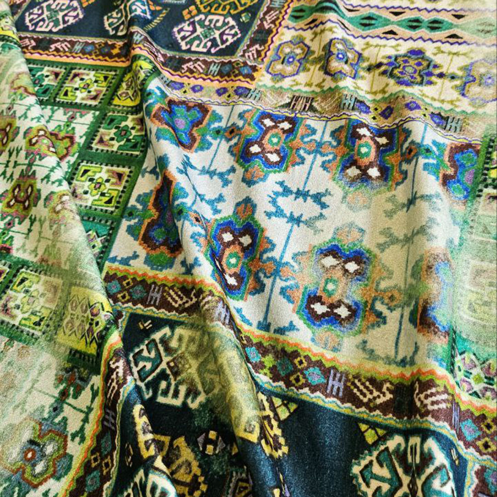 Плательная вискоза Etr0. Рисунок в виде пэчворка стилистике бренда. Бархатистая поверхность, но без активного лоска, внешне напоминает фланель. Материал мягкий, пластичный. Для платьев, юбок, мягких костюмов