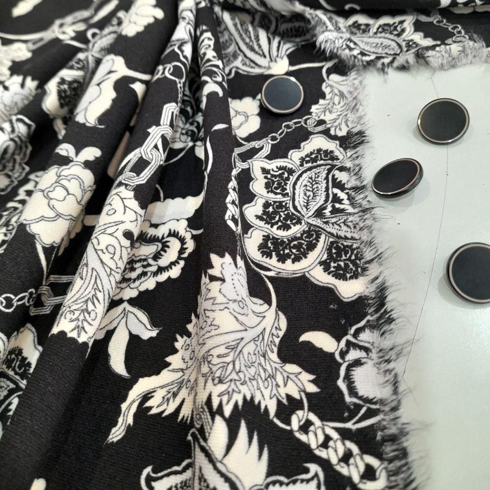 Плательно-костюмная вискоза Etr0. Трикотажное полотно Punto Milano. Упругий материал средней плотности. Гладкая матовая поверхность. Растительный орнамент в стилистике Etr0. Черно-белая гамма. Пластичный материал с хорошей драпируемостью. Для платьев, блуз, юбок, ниспадающих мягких костюмных изделий.