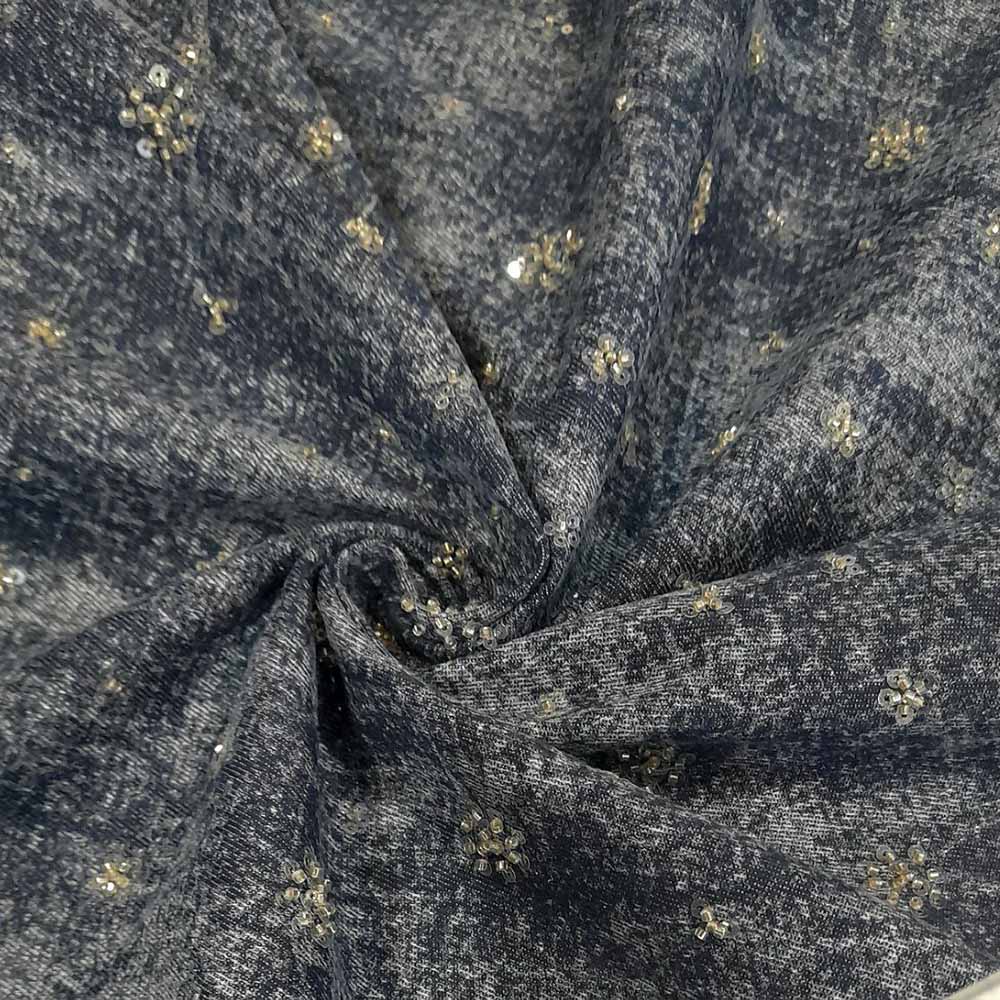 Редкий фактурный джинс с вышивкой из бисера с пайетками MiuMlu. Хлопковое полотно темно-синей цветовой гамме с неоднородным окрасом. Вышивка состоит из маленький "цветочков" из пайеток с бисером. Материал достаточно плотный, держит форму, но пластичный подходит на тренчи, куртки, объемные юбки, жакеты.