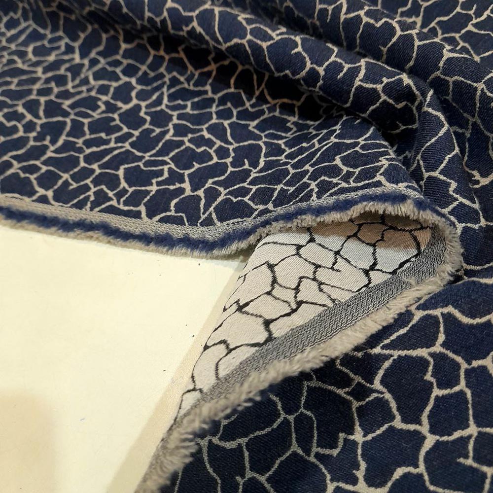 Плательно-костюмный джинс жаккардового плетения. В составе вискоза и мягкая шерсть вирджин и добавка эластана. Спокойное сочетание темно-синего и молочного оттенков. Гладкая матовая поверхность с переплетение диагональной направленности. Материал средней плотности, мягкий и пластичный. Для платьев, костюмов, жакетов, юбок