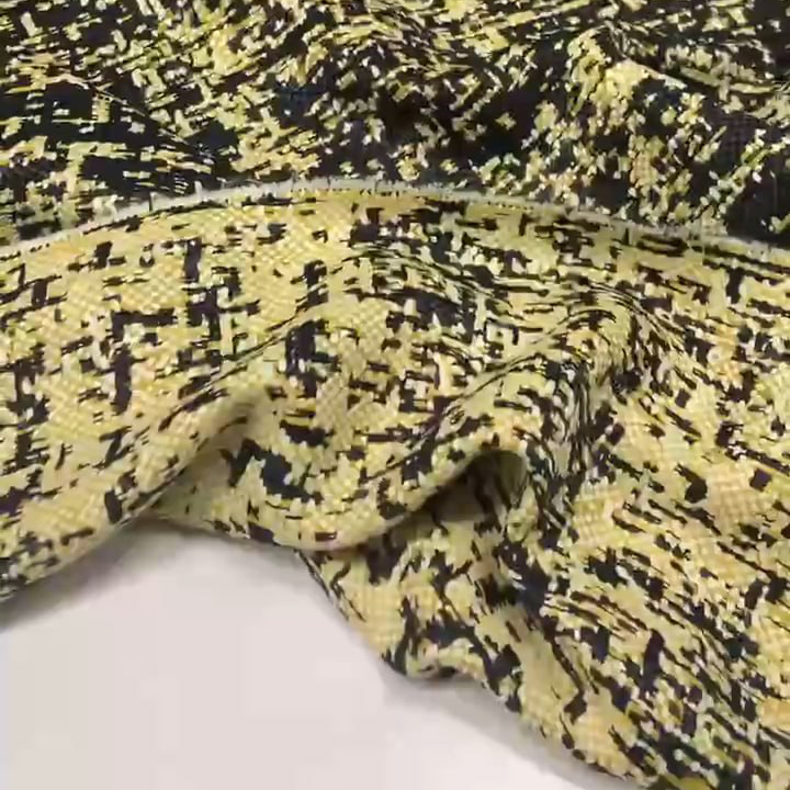 Плательно-костюмный твид B0ttega Veneta. Пестрое переплетение в желто-черном сочетании с вкраплениями белого. Стабильная, не рыхлая структура. Пластичный материал костюмной плотности. Идеален для юбок и жакетов.