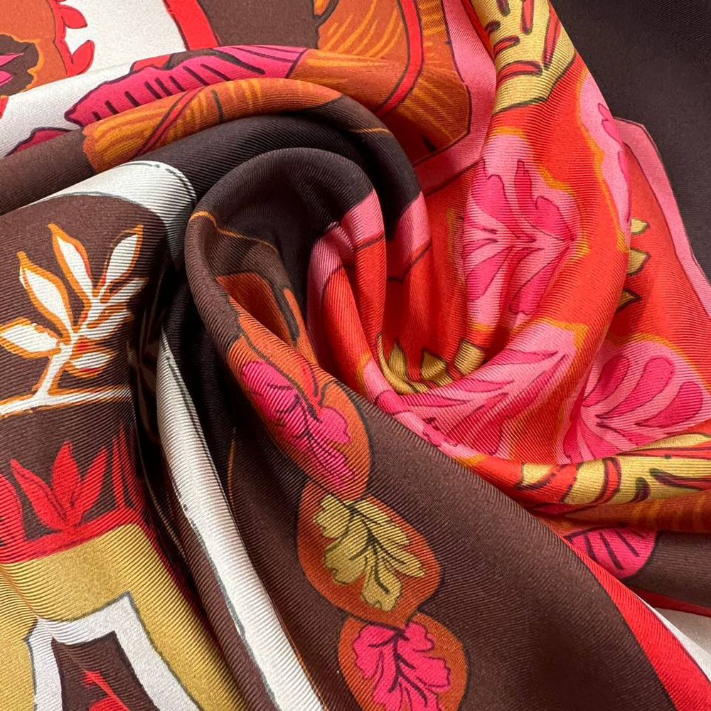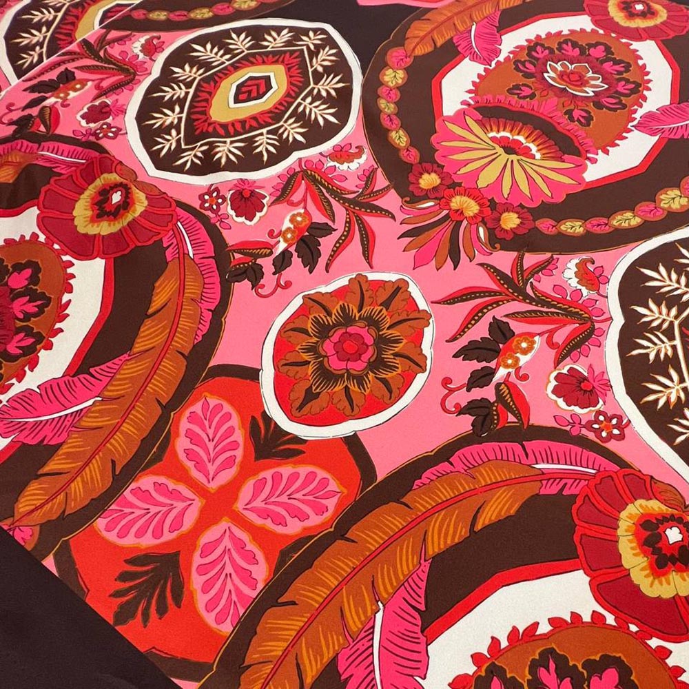 Шелковый твил Luisa Spagan0li. Яркий выразительный принт в стилистике бренда. Растительные орнаменты в красноватых тонах. Рисунок представлен панелями. Мягкий матовый шелк для блуз,, платьев, топов.