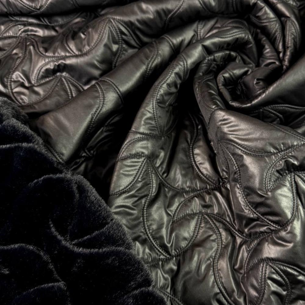 Фирменная дизайнерская стежка с эко-мехом. Дизайнерская выставка в Париже Premiere Vision. Сложный рисунок стежки с двойными строчками. Изнаночная сторона -черный мех с коротким ворсом. Можно шить двухсторонние изделия Для курток на теплую зиму, бомберов, стеганых тренчей.