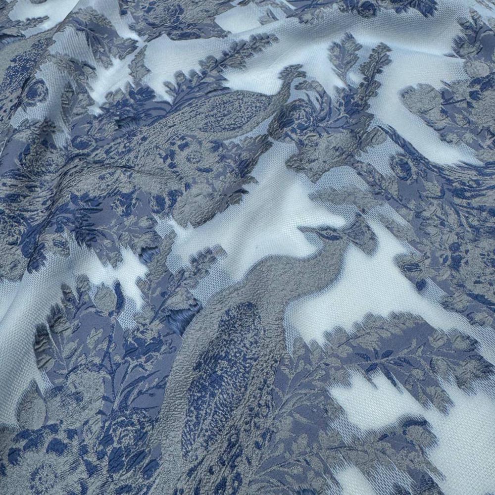 Плательно-костюмное филькупе. Крупный выразительный рисунок с павлинами. Выглядит фактурно и эффектно. Нейтральная серо-голубая цветовая гамма. Ткань достаточно плотная, немного держит форму. Для платьев, объемных блуз, жакетов.
