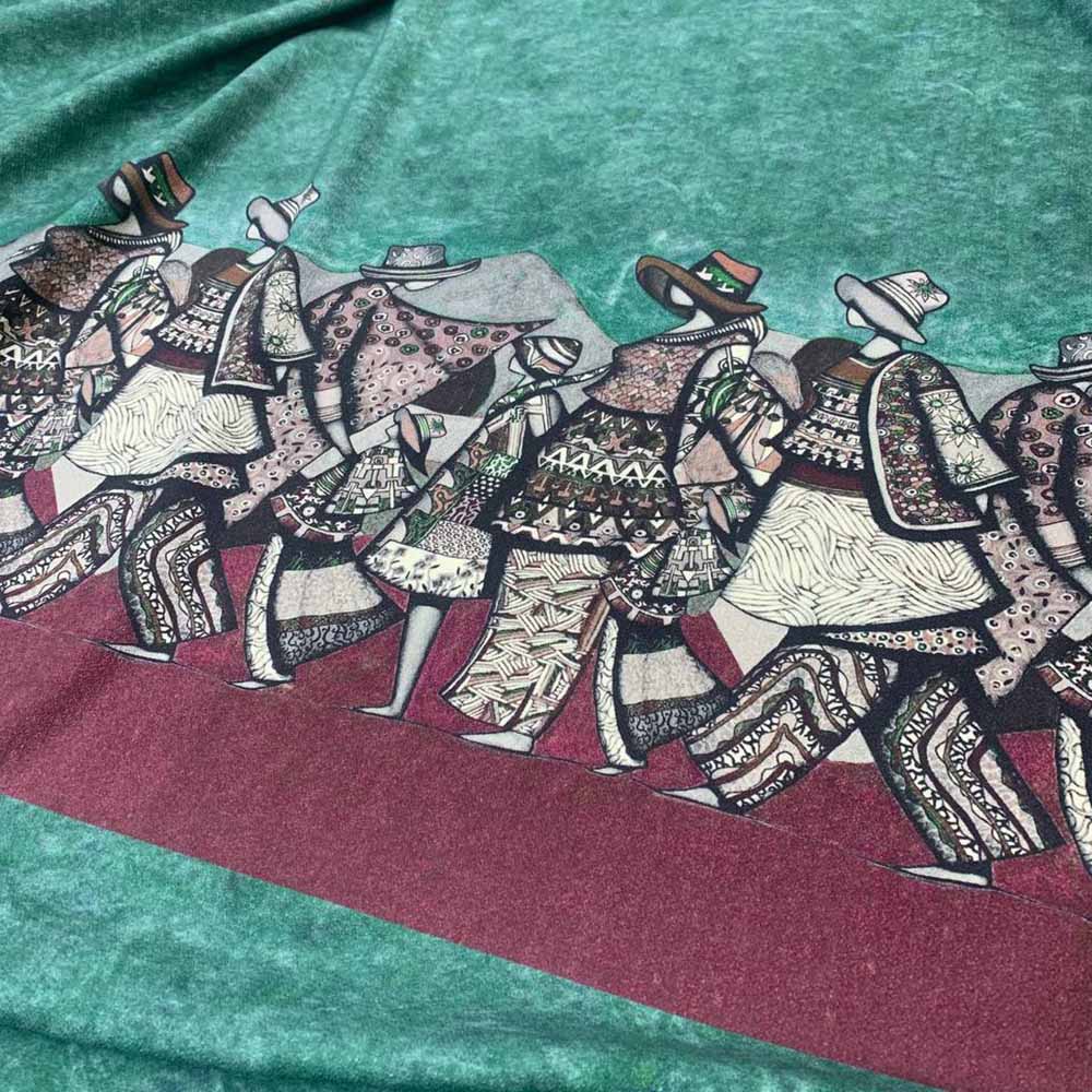 Креповая шерсть с эластаном. Интересный рисунок-бордюр с со стилизованными человечками. Принт детализированный, стоит из разных других орнаментов. Материал легкий, универсальный по плотности. На платья, брюки, юбки, блузы.