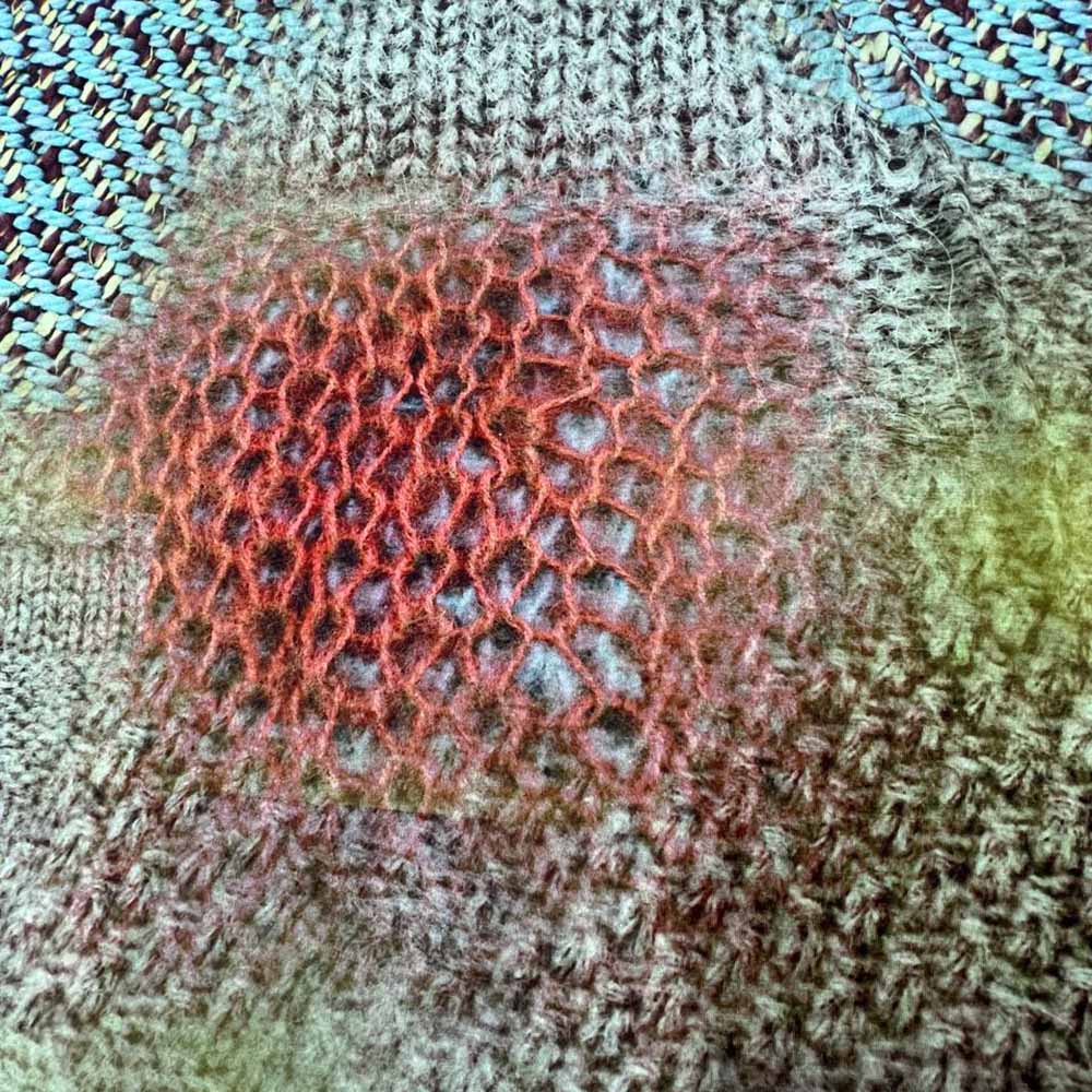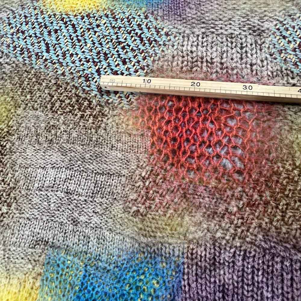 Тонкий вискозный трикотаж с необычным принтом. Изюминка в оригинальном рисунке - своеобразный коллаж из вязаных текстур. Поверхность ткани матовая, тактильно шелковистая. Для уникальных мягких ниспадающих платьев и топов.