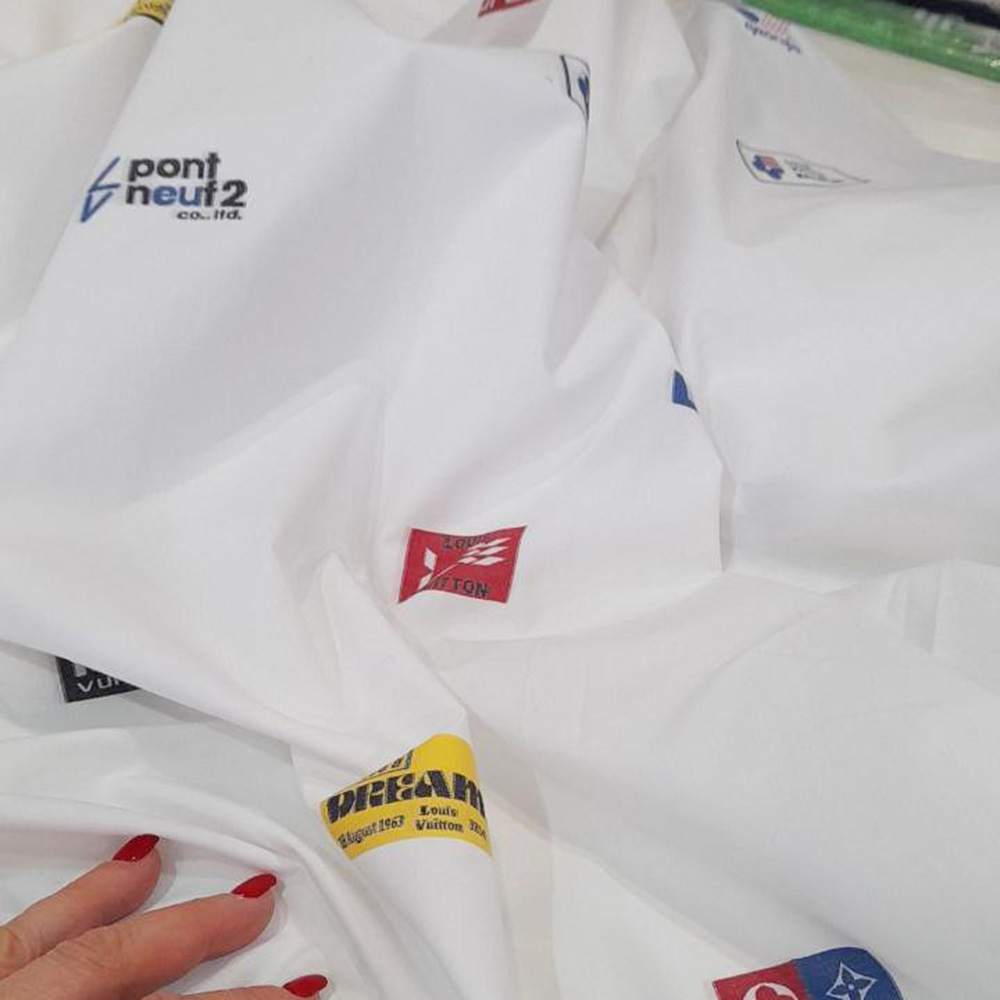 Плательно-сорочечное филькупе из 100% хлопка. Сток Luis Vuit0n. \Цвет фона - натурально белый. Рисунок с разноцветными вариациями логотипа бренда. Плотность средняя, пластичный и мягкий материал.