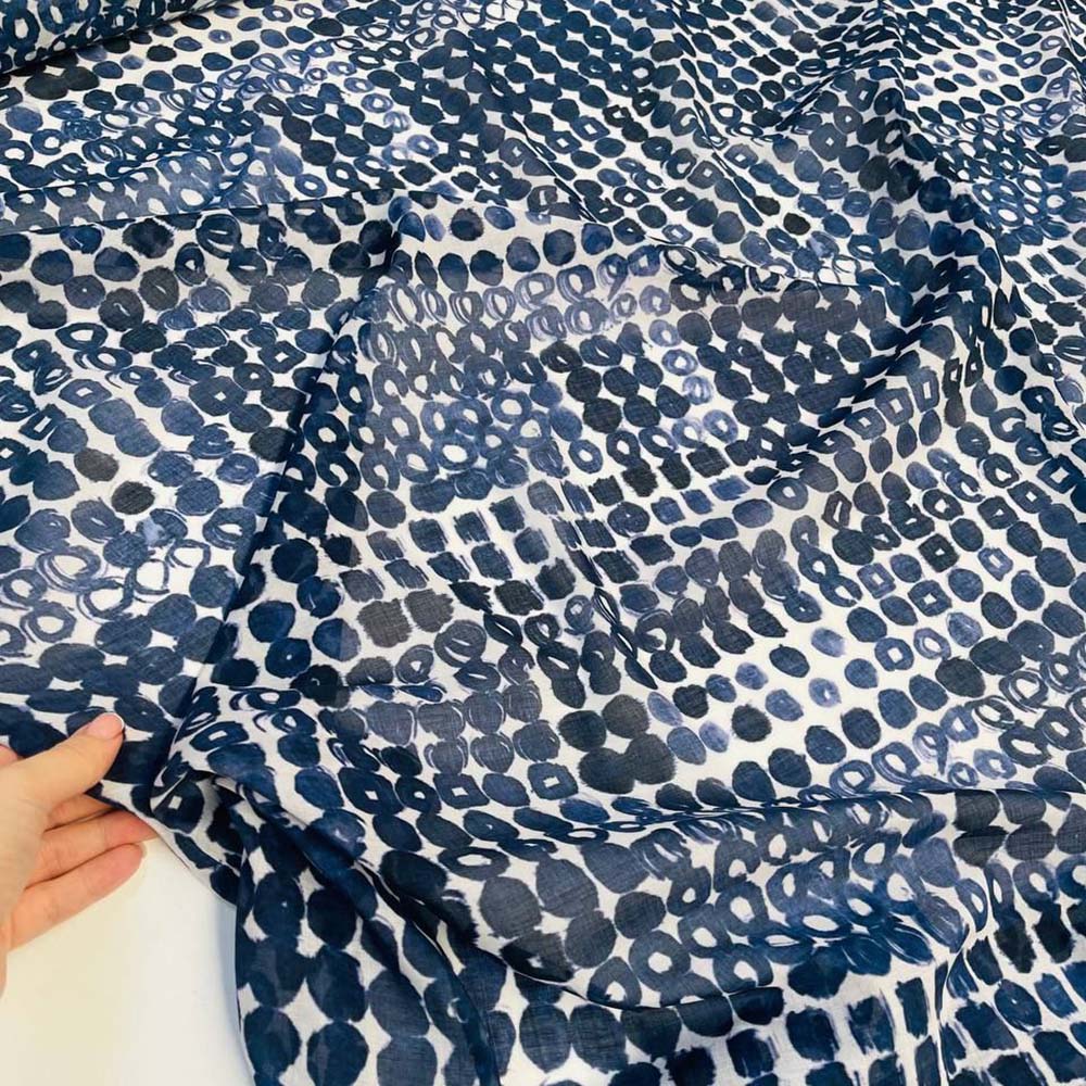 Плательно-блузочный батист с натуральным составом. Хлопок с шелком. Темно-синий рисунок на белом фоне. Мягкий, очень легкий и пластичный материал. Для пошива блуз, легких платьев.