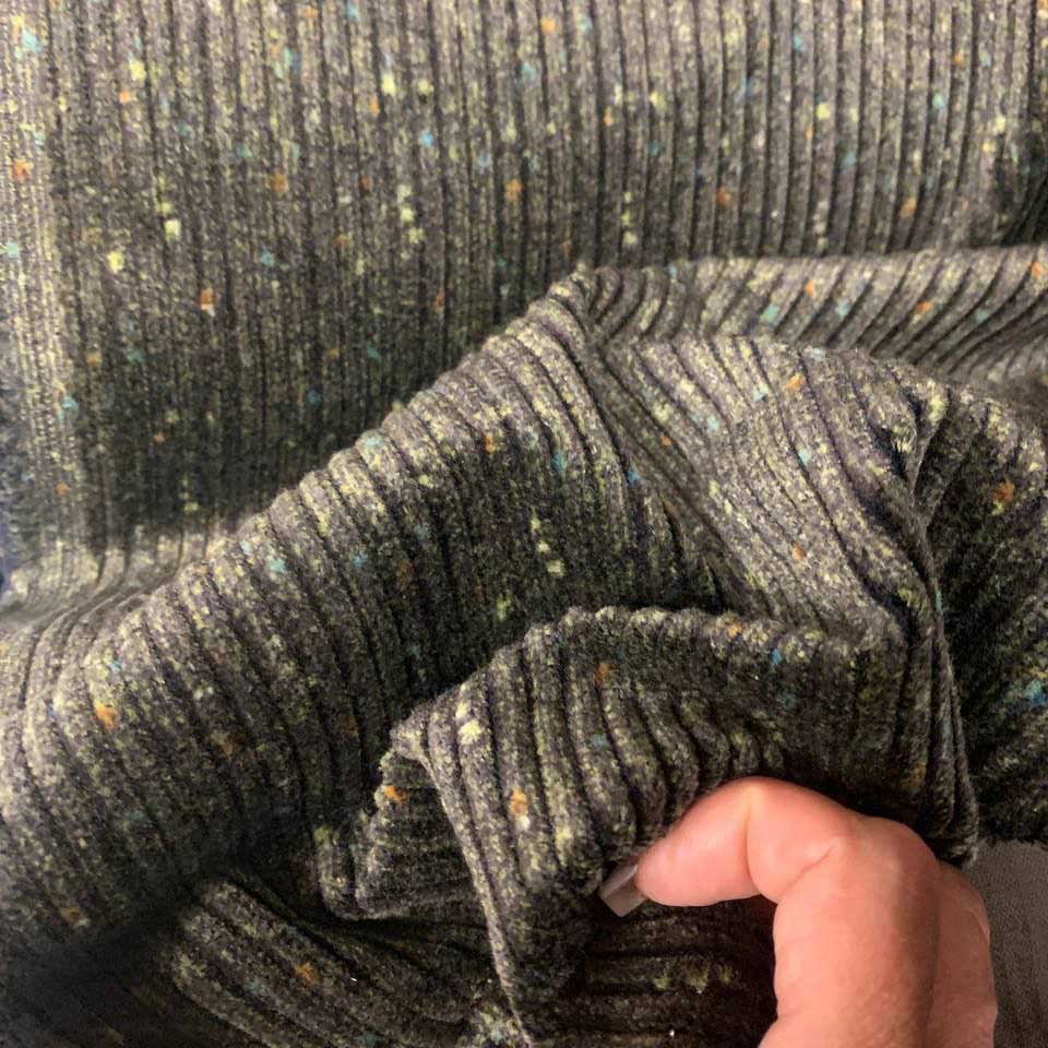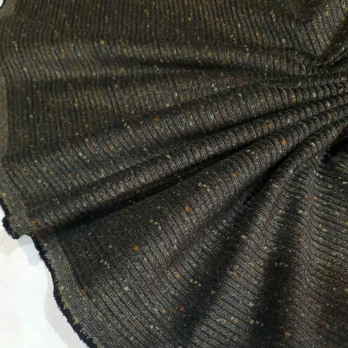 Хлопковый вельвет. Мягкий, пластичный, достаточно плотный. Поверхность в крупный рубчик.  К основному цвету добавляются разноцветный вкрапления-точки, что делает оформление более интересным.  Подойдет для жакетов, плотных платьев, костюмов, юбок